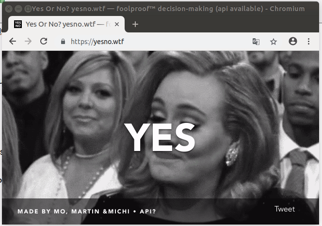 https://yesno.wtf 这是一个神奇的网站,当你对某件事拿不定注意,需要别人推你一把时,可以访问它,它会随机返回一个 gif 动画,点头表示 yes,摇头表示 no,帮你做这个艰难的决定。直接访问 https://yesno.wtf ,注意在地址栏中不带 api 字样,可以得到这样的结果: