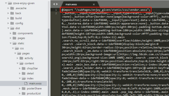 那么就需要把@import "/static/css/vendor.wxss"; 改为:@import "/subPages/enjoy_given/static/css/vendor.wxss";复制代码