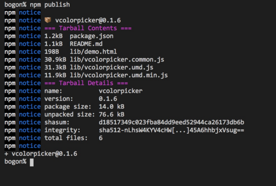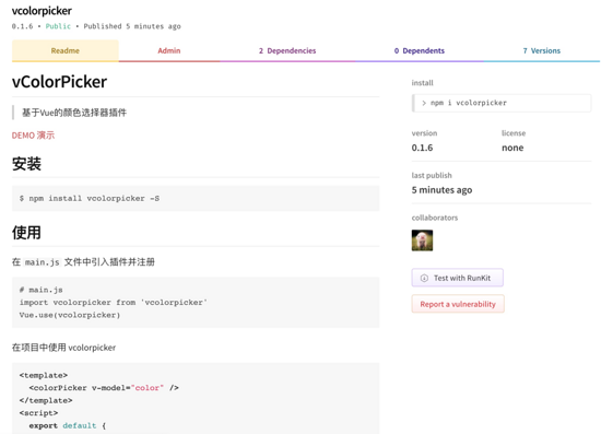 发布成功后稍等几分钟,即可在 npm 官网搜索到。以下是刚提交的 vcolorpicker