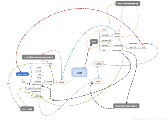 其实所谓响应式属性,即当_route值改变时,会自动调用Vue实例的render()方法,更新视图。 $router.push()-->HashHistory.push()-->History.transitionTo()-->History.updateRoute()-->{app._route=route}-->vm.render()