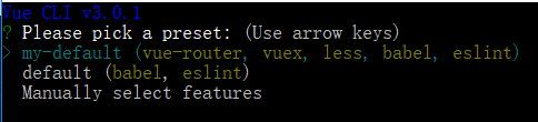 Please pick a preset: Manually select features Check the features needed for your project: Router, Vuex, CSS Pre-processors, Linter, Unit Pick a CSS pre-processor (PostCSS, Autoprefixer and CSS Modules are supported by default): SCSS/SASS > LESS Stylus