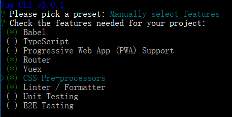 Please pick a preset: Manually select features Check the features needed for your project: Router, Vuex, CSS Pre-processors, Linter, Unit Pick a CSS pre-processor (PostCSS, Autoprefixer and CSS Modules are supported by default): Stylus Pick a linter / formatter config: Prettier Pick additional lint features: (Press <space> to select, <a> to toggle all, <i> to invert selection) >( ) Lint on save // 保存就检测 ( ) Lint and fix on commit // fix和commit时候检查