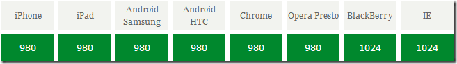 通俗的讲,移动设备上的viewport就是设备的屏幕上能用来显示我们的网页的那一块区域,在具体一点,就是浏览器上(也可能是一个app中的webview)用来显示网页的那部分区域,但viewport又不局限于浏览器可视区域的大小,它可能比浏览器的可视区域要大,也可能比浏览器的可视区域要小。在默认情况下,一般来讲,移动设备上的viewport都是要大于浏览器可视区域的,这是因为考虑到移动设备的分辨率相对于桌面电脑来说都比较小,所以为了能在移动设备上正常显示那些传统的为桌面浏览器设计的网站,移动设备上的浏览器都会把自己默认的viewport设为980px或1024px(也可能是其它值,这个是由设备自己决定的),但带来的后果就是浏览器会出现横向滚动条,因为浏览器可视区域的宽度是比这个默认的viewport的宽度要小的。下图列出了一些设备上浏览器的默认viewport的宽度。