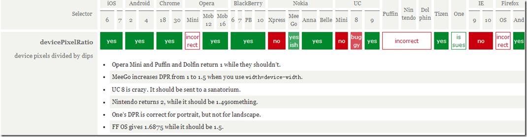 测试结果表明 initial-scale=1 也能把当前的viewport宽度变成 ideal viewport 的宽度,但这次轮到了windows phone 上的IE 无论是竖屏还是横屏都把宽度设为竖屏时ideal viewport的宽度。但这点小瑕疵已经无关紧要了。