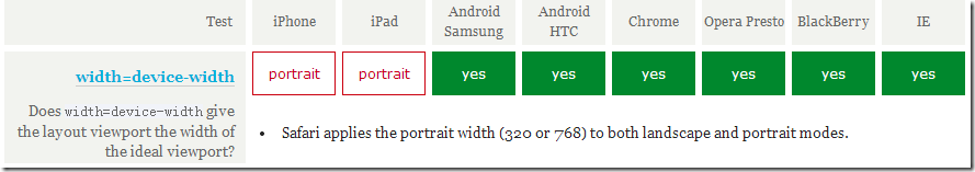可以看到通过width=device-width,所有浏览器都能把当前的viewport宽度变成ideal viewport的宽度,但要注意的是,在iphone和ipad上,无论是竖屏还是横屏,宽度都是竖屏时ideal viewport的宽度。