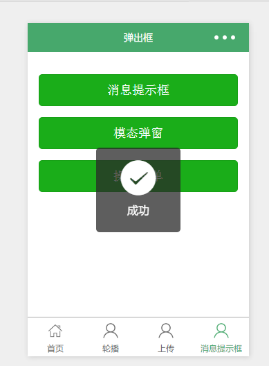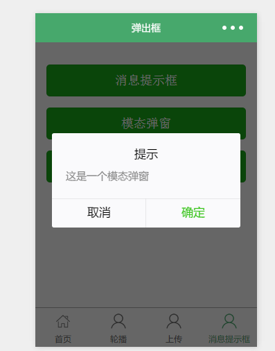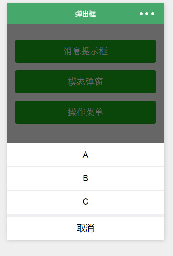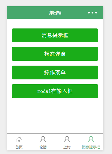 view class="container" class="zn-uploadimg"> <button type="primary"bindtap="showok">消息提示框</button> <button type="primary"bindtap="modalcnt">模态弹窗</button> <button type="primary"bindtap="actioncnt">操作菜单</button> </view>