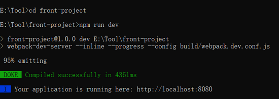 选择 webpack作为打包工具,初始化项目,项目名是front-project。安装过程按照提示填写相关配置(默认按Enter键即可), 这些配置最终会写到项目的 package.json 并且安装相关模块。