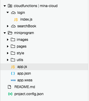 项目目录分为了2大块内容:cloudfunctions(云函数)和miniprogram。miniprogram存放的是和普通开发相同的业务代码和资源,cloudfunctions中则存放了可以上传至云端的代码,在云开发中被称为云函数。