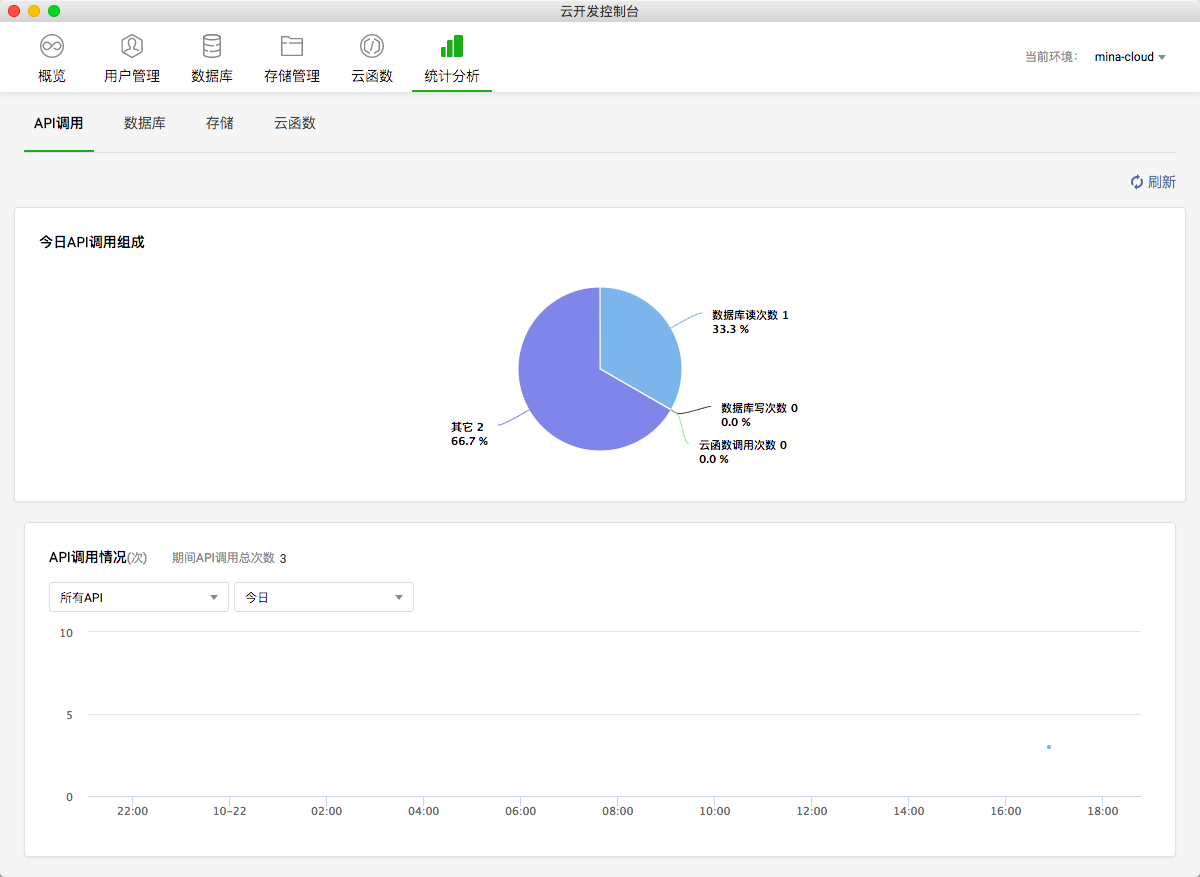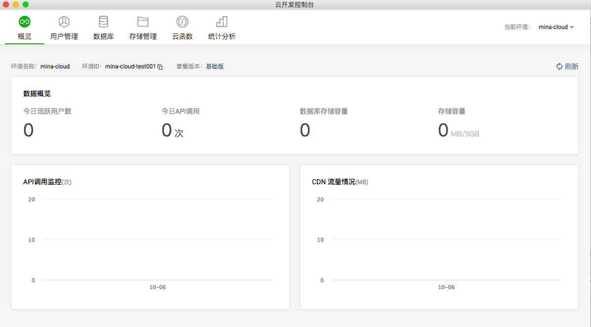 概览界面如上图所示,展示了该 云开发项目下使用云资源的统计数据。