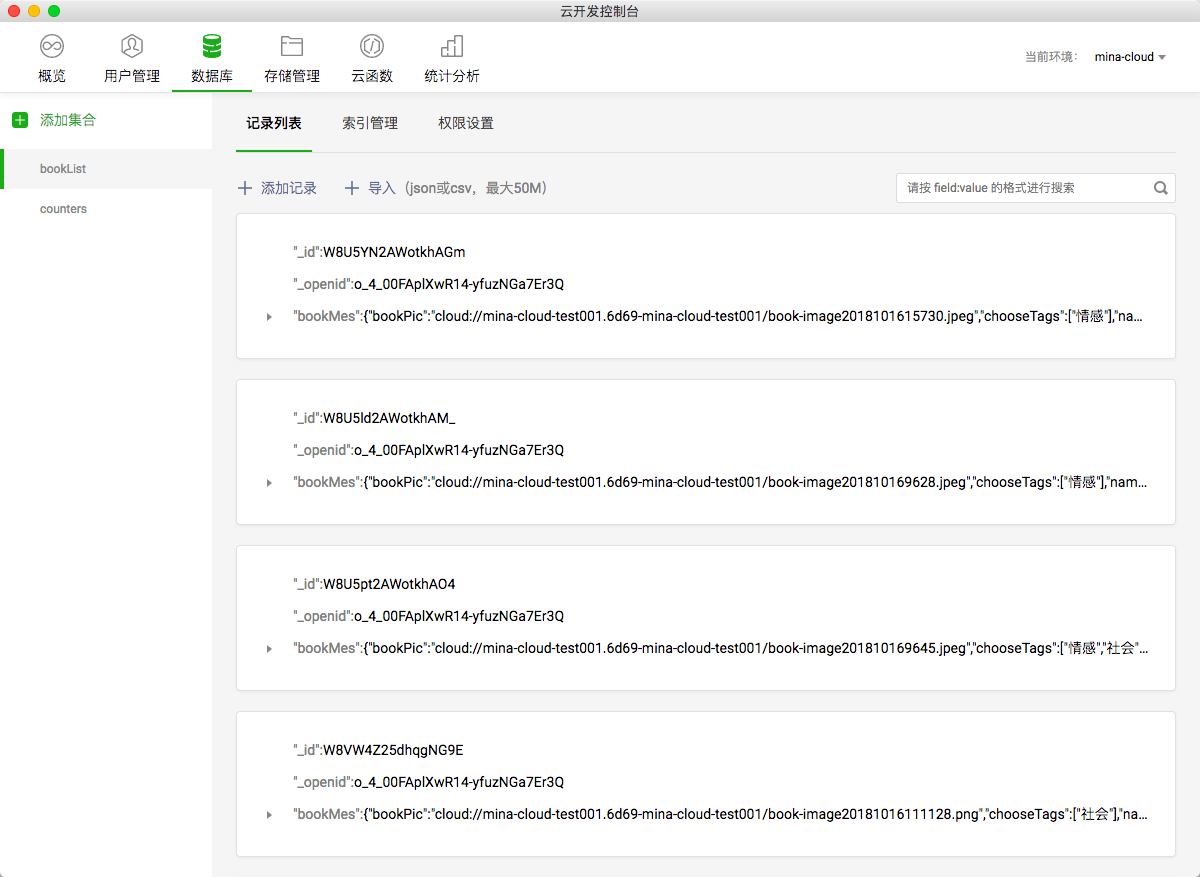 数据库是控制台中最常用的功能之一,在该界面下,可以快速建立数据集合,可以理解为数据表。可在控制台中建立新的集合,添加记录有三种方式:控制台手动添加、文件导入以及调用api。调用api会在每条记录中自动插入用户_openid。