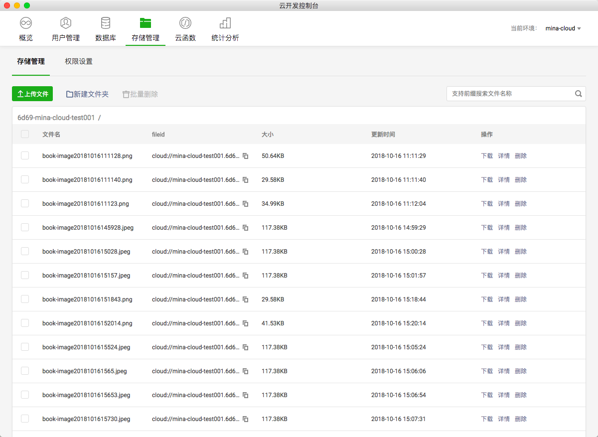 存储管理可保存小程序端上传的文件,可通过调用api进行上传,上传名称和路径需要自己定义。