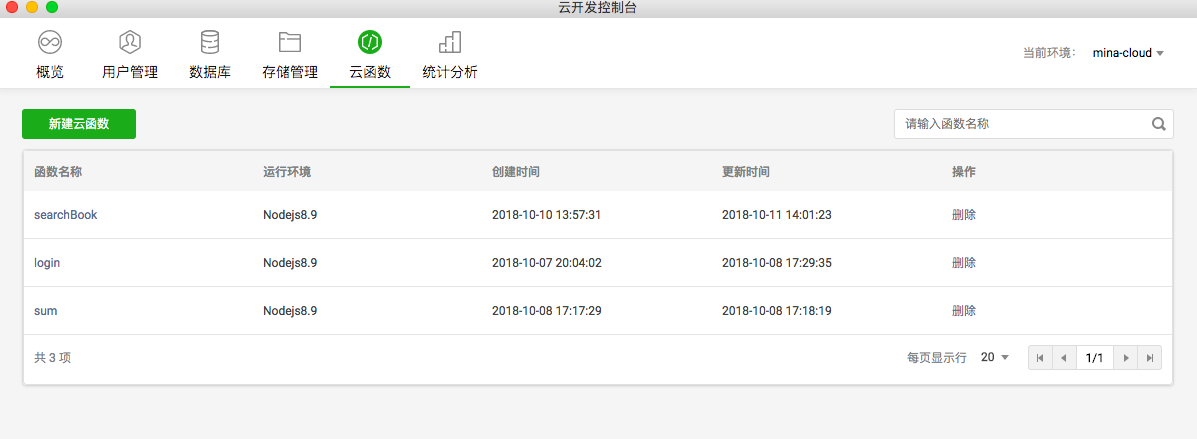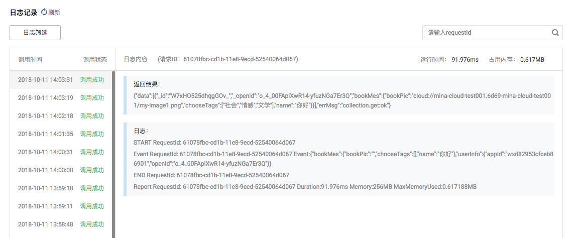 云函数对cloudfunctions中上传的函数进行管理,可进行调试,查看调用日志等信息。