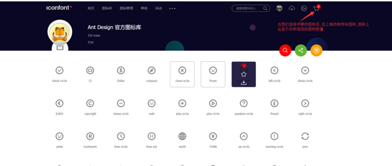 2. 注意: 我们在选择图标是后,如果是需要多个图标就将选中的图标加入购物车,但是如果我们没有在这一个图标库中找到自己需要的图标时,可以去其他的图标库中进行选择,但是要记住离开这个图标库的时候,记得将选择的图标加入自己创建的项目中,