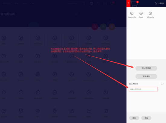 4. 进入购物车页面,然后点击提交至项目中,因为我们是新建的项目,所以要先在图标库中新建项目后,才能将以选中图标加入项目中,进行保存,