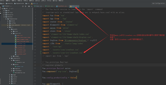 10. 在main.js引入iconfont.css文件,也就是刚刚我们修改的文件,这样就不用每一个组件想用图标的时候都要引一遍了,