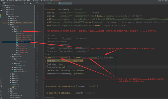 9. 将下载好的文件放入项目中去,首先在src下的assets项目新建一个文件夹,名字自己定义,注意要明了,建下载的文件放进去就好的,然后就可以修改iconfont.css文件,修改完,才能进行显示,