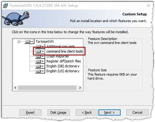 我这里使用的是TortoiseSVN-1.9.4.27285-x64-svn-1.9.4,安装过程需要注意的是,默认安装没有选择”command line client tools”,这里需要选上。