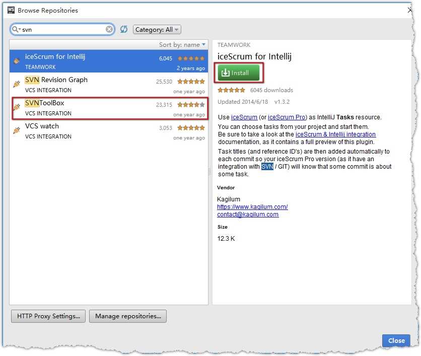 (3)搜索“svn”,然后在搜索结果中点击“SVNToolBox”,单击“Install”按钮;;