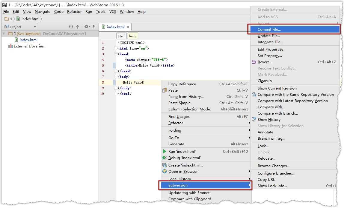 (1) 如果你的项目是SVN受控项目,那么在WebStorm的项目根目录上单击右键,便可以看到Subversion的右键菜单,选择相对应的SVN功能操作即可对项目进行操作;