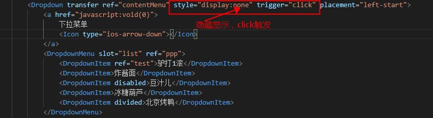 源码之下,了无秘密,简单陈述下思路,在模板中正常使用Dropdown组件,属性、样式需要单独设置(style="display:none" trigger="click"),即默认不显示,click触发,右键按下时首先设置其可见,在更改reference对象引用即可。
