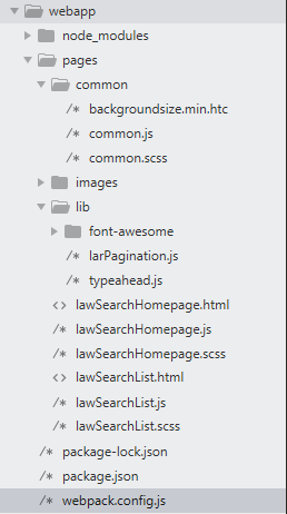 2、单独打包css,使用到的插件extract-text-webpack-plugin ,loader有style-loader、css-loader、sass-loader、node-sass,因为每个页面要引入相对应的css文件,所以,在js入口文件里通过require('./lawSearchHomepage.scss')引如对应的scss文件,打包后css文件会单独打包,并通过link的形式引入html