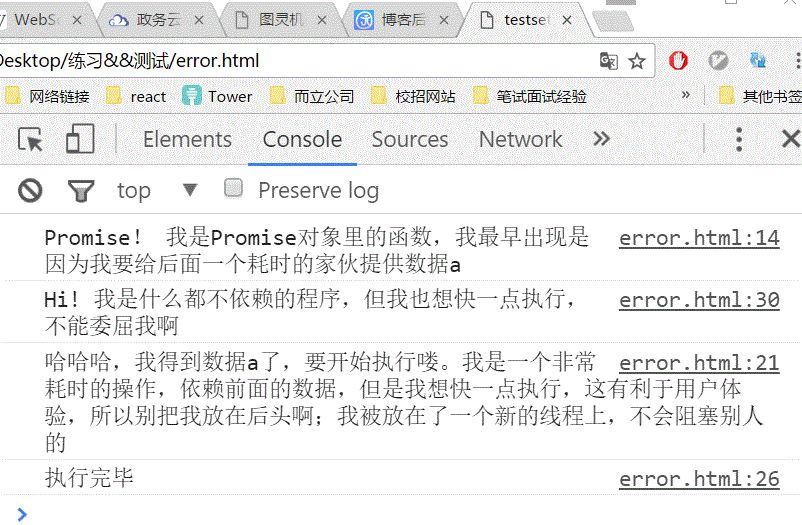 说明: 在已经执行过的情况下,录制屏幕,然后按下刷新键,可以发现,在new Promise里的函数是立即执行的,紧接着是promise.then()之后的函数立即执行,而没有等待then()函数,最后进入then()函数,说了一堆废话,最后大约2 ~ 3s之后执行结束。故promise.then()函数才是真正的异步执行。