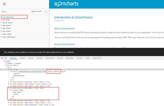 页面首次加载,左侧导航第一个目录 Introduction 高亮,从控制台可看出,该元素增加了 active 类,同时 li[data-section="net-chart"] 节点下只有一个元素节点 a