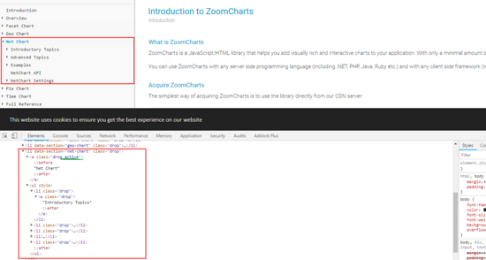 点击 Net Chart 目录, Net Chart 目录高亮,下拉显示子目录,查看控制台,其元素节点增加 active 类,并增加 ul 子元素节点, 此时,第一个子目录节点也只有一个子元素节点 a