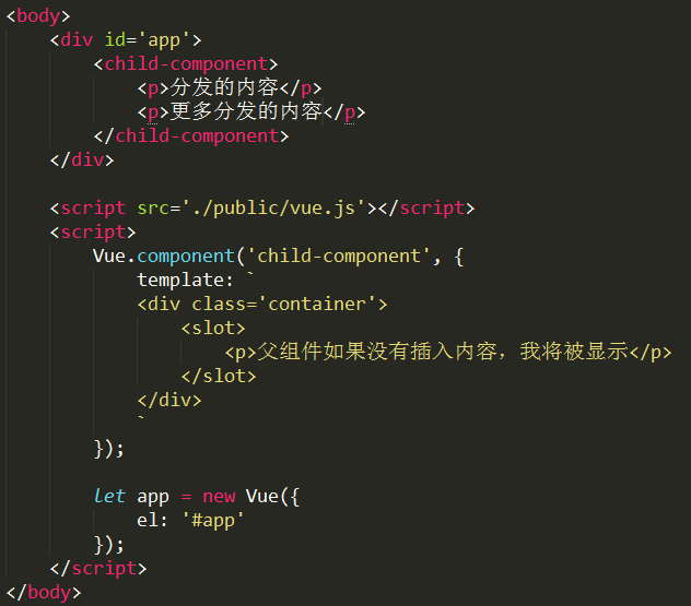 如果<child-component></child-component>标签之间没有插入那两个p标签的话,页面会显示子组件模板中定义的“<p>父组件如果没有插入内容,我将被显示</p>”这一则内容,但如果<child-component></child-component>标签之间有插入内容的话,则子组件模板中的<slot></slot>标签以及之间的内容都会被替换成<child-component></child-component>标签之间插入的内容。