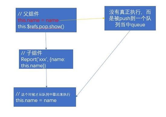 这句话就是说,当我们在父组件设置this.name=name的时候,vue并不会直接更新到子组件中(dom的更新也一样未立即执行),而是把这些更新操作全部放入到一个队列当中,同个组件的所有这些赋值操作,都作为一个watcher的更新操作放入这个队列当中,然后等到事件循环结束的时候,一次性从这个队列当中获取所有的wathcer执行更新操作。在我们这个例子当中,就是我们在调用show的时候,实际上,我们的this.name=name并未真正执行,而是被放入队列中。vue的这种做法是基于优化而做的,毋庸置疑,不然我们如果有n多个赋值vue就执行n多个dom更新,那效率将会非常的低效和不可取的。