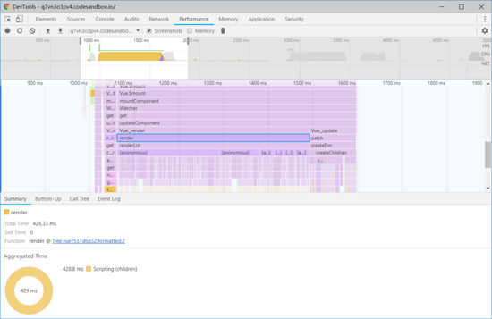 你可以通过这个CodeSandbox 完整示例来实际观察下性能损耗。点击箭头展开或折叠某个节点,在 Chrome DevTools 的控制台(不要使用 CodeSandbox 的控制台,不准确)中输出如下。