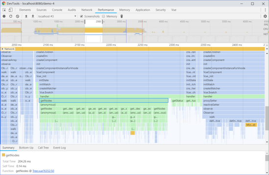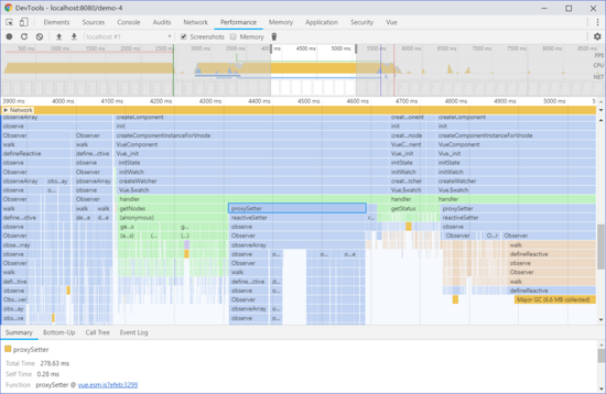 我们发现,在 getNodes 方法调用之后,有一段耗时很长的 proxySetter 。这是 Vue 在为 nodes 属性添加响应式,让 Vue 能够追踪依赖的变化。 getStatus 同理。