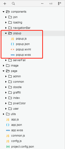 新建一个 components 文件夹,用于存放我们以后开发中的所用组件,在 components 组件中新建一个popup文件夹来存放我们的弹窗组件,在popup下右击新建 Component 并命名为 popup 后,会生成对应的 json wxml wxss js 4个文件,也就是一个自定义组件的组成部分,此时项目结构应该如下图所示: