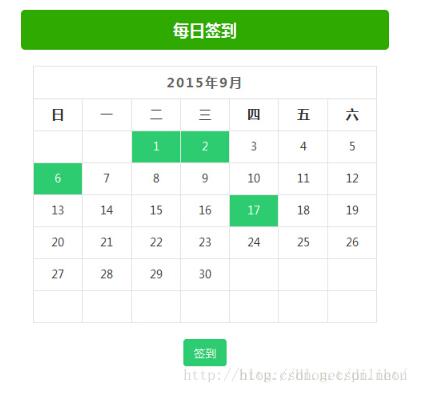 $("#calendar").html(str); 说明:signList是后台查询的已签到的时间集合,传入到js方法中会去判断哪一天签到了,然后改变签到天的显示效果,如上图!