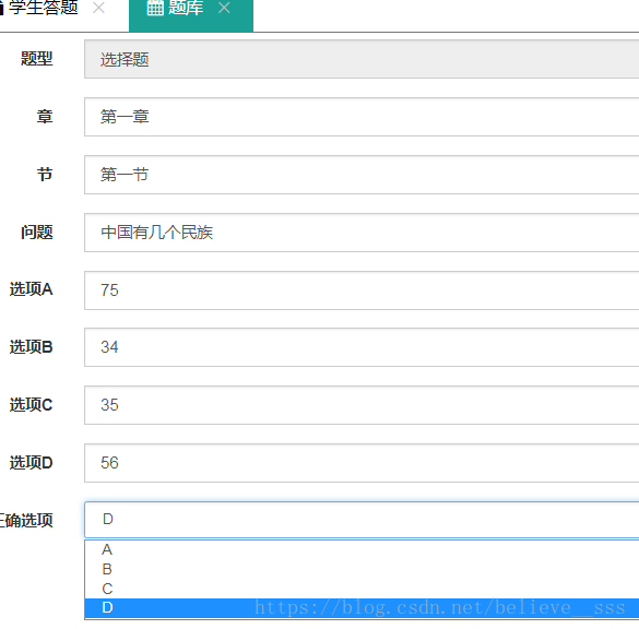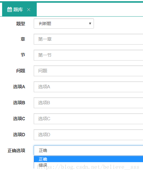 在做项目的时候,一个添加问题题目,选项和答案的问题,题目类型分为选择题,判断题,和多选题三种,此处需要添加一个二级联动的功能,即当题型为选择题的时候,正确选项的下拉框里出现的是A,B,C,D.如果题型是判断题,正确选项的下拉框内容为正确,错误,如果题型类型为多选题,则正确答案的输入框变为可输入答案型的文本框。实现效果在文末。