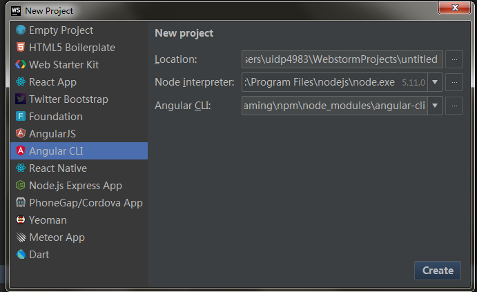 可以看到图片上有两个关于Angular的选择。一个是AngularJS,这个创建的是基于Angular1.0版本类的project。另一个Angular CLI创建的才是基于Angular2.0的项目。