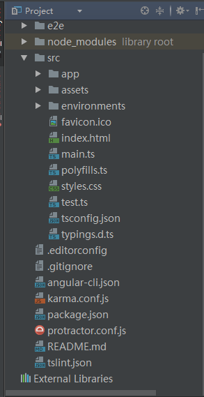 你会发现webStorm是如此的贴心,app文件夹都给我们创建好了,不仅如此,文件夹里还有app.module.ts和app.component.ts。你需要改动什么直接在这些ts文件里改动就可以了。