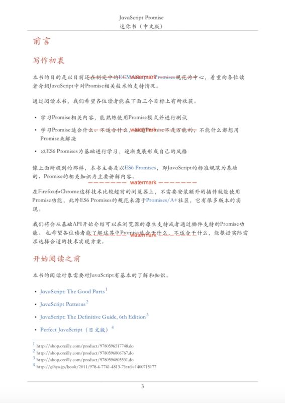 项目中有用到node做中间层,期间有个为PDF文件添加水印的需求,网上搜了不少帖子,发现有以下几点存在的问题。