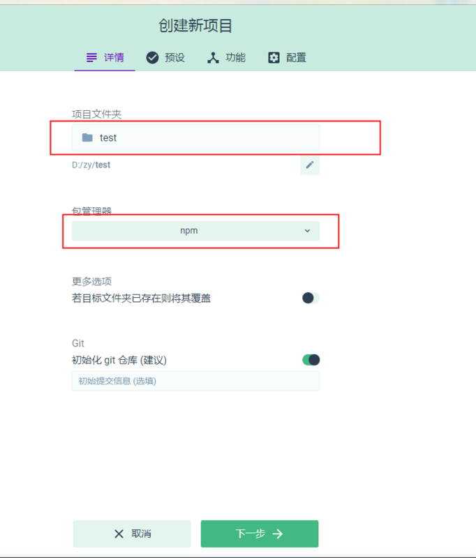 2.点击创建新项目,输入项目名字,包管理器选择npm