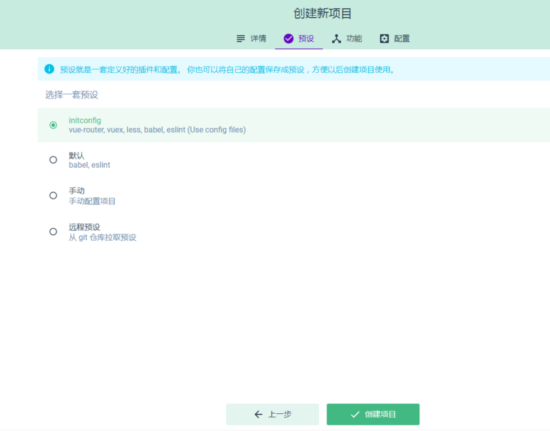 (1). 选择配置,第一次创建项目,只有后面两个,分别是默认和手动自定义选择。第一个是我创建过后保存的,这里选择最后一个,手动选择配置