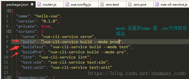 “buildTest” :“vue-cli-service build --mode test”, "buildPre" : "vue-cli-service build --mode pre" "build" : "vue-cli-service build --mode prod" // 打包,会把process.env.NODE_ENV设置为步骤4中‘.env.alpha'文件设置的值。 // 注意,这里 “--mode 名字“ 要和步骤2中文件名“.env.名字”名字保持一致