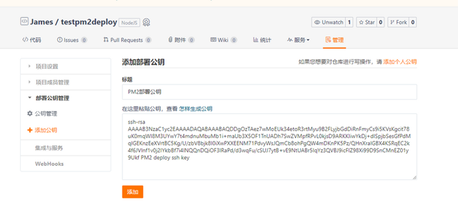 将公钥添加入gitee或github中,注意本地环境添加的是个人公钥,而服务器环境需要添加在部署公钥下。