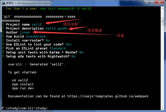 4、运行vue init webpack(注:模板名称)sell2(注:项目名称)