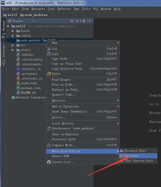 注:webstorm一打开就卡死了,没办法操作文件夹这种情况的解决方法为,首先在文件夹形式下打开删除node-modules文件夹,然后进行阻止检索的方法,然后在重新cnpminstall就好*(这种方法需要安装完依赖项先运行一次然后删除node_modules子文件,webstorm打开项目,禁止检索node_module文件夹,然后在删除该文件夹,重新安装即可)