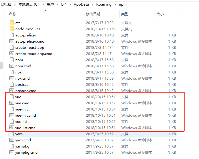 我们可以打开c盘>用户>用户名>AppData>Roaming>npm查看我们全局安装的vue-cli,如下图: