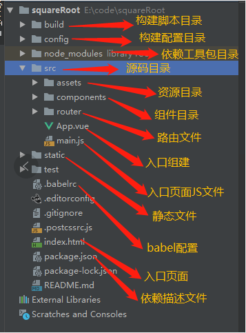 虽然我们是通过vue-cli生成的项目结构,但还是希望读者能够清楚的知道每个文件的作用,这样对于我们学习该脚手架以及搭建自己的脚手架会有很好的帮助,如下图,是一级目录下的文件的作用:
