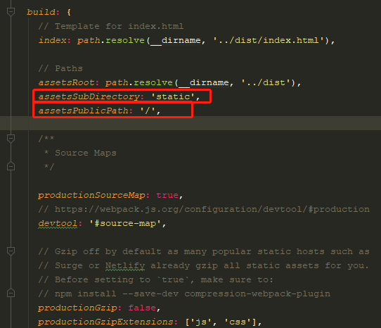 构建相关的代码主要是放在build文件夹和config文件夹下,包括了开发环境和生产环境,即dev和product,可以打开文件进行阅读,有接触过node的小伙伴应该可以很快读懂对应文件代码的作用,这里就不做详细的介绍了,需要注意的一点是,我们需要修改打包后文件的路径的时候,可以通过修改config文件夹下的index.js文件,如下图: