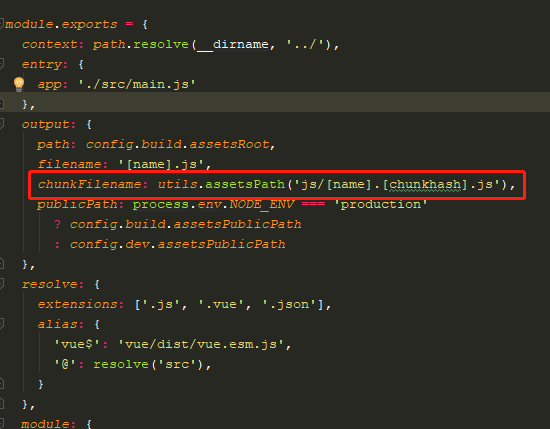 上面的代码中,我们应用到了几个知识点,首先是滚动行文,这里我们配置了当路由跳转的时候,默认是滚动到(0,0)位置,即页面开始位置,其次我们用到的redirect是一个路由重定向的配置,接下来,在路由"/root"下,配置了具名视图,加载对应组件到对应视图,我们引入组件的方式使用到了箭头函数,这样写的目的是为了实现路由的懒加载,这样构建,只有在路由被执行的时候,才有引入对应的组件,对于页面性能的优化有很大的帮助;这里还需要注意的是,我们在引入的这些组件中,其实默认都是打包到一个文件下的,这样就会导致一次性引入的文件过大,为此,我们可以利用webapck打包工具,我们在build>webpack.base.conf.js文件下,增加如下代码,用于配置输出文件的模块名称,[name]是文件的名称,[chunkhash]是打包文件的哈希值,加上这个是为了将其作为版本号,以解决浏览器缓存机制带来的问题:
