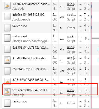 通过控制台,我们可以查看当前加载的文件资源,当我们点击测试按钮的时候,页面发生的跳转,这时候,我们会发现,在Network下,会加一条新的资源加载信息,这一条就是我们的分块打包后请求的资源;