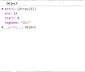 // 第一次进入while循环时,由于字符串以<开头,所以进入startTag条件,并进行AST转换,最后将对象弹入stack数组中